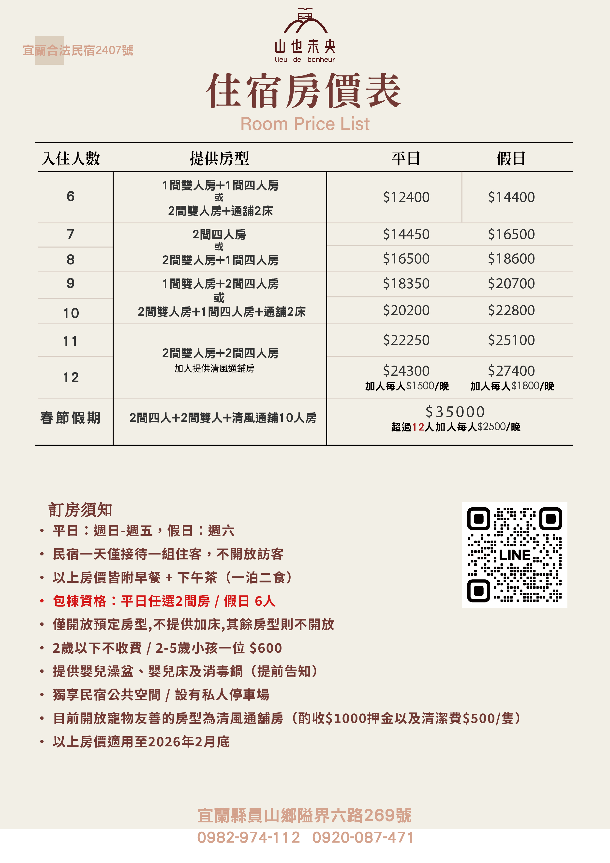 感謝大家對「山也未央」的關注與喜愛!我們持續致力於提供優質的住宿體驗與自然融合的生活空間。以下為2025年度房價公告資訊,敬請參閱: