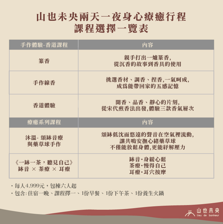 課程內容:身心療癒行程五選一立即點擊訂房,開始您的療癒之旅!